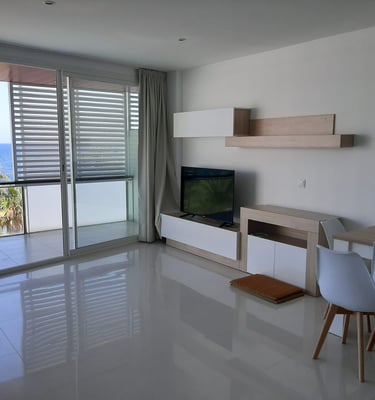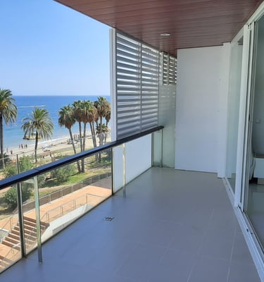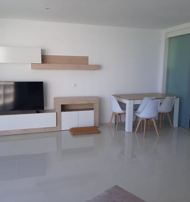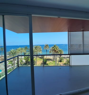 The spacious living room with floor to ceiling windows is the perfect place to relax and enjoy beautiful unobstructed views of the Mediterranean Sea. The terrace is also ideal for al fresco dinners with family or friends accompanied by the boats that ride the waves of the endless blue sea on the horizon.